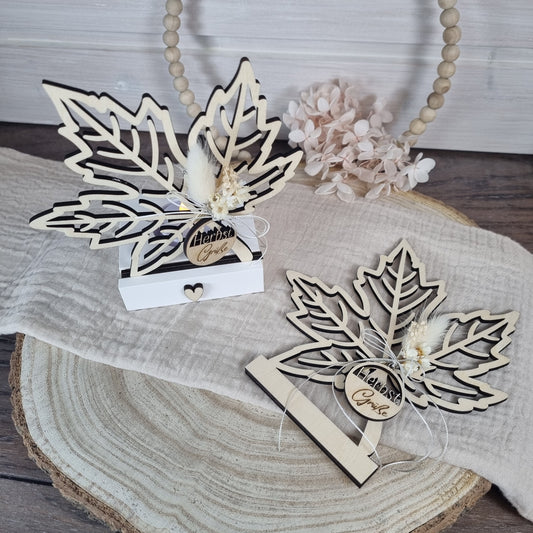 Teelichthalter Ahornblatt mit Trockenblumen und Herbstgrüßen - Herbstliches Deko-Set